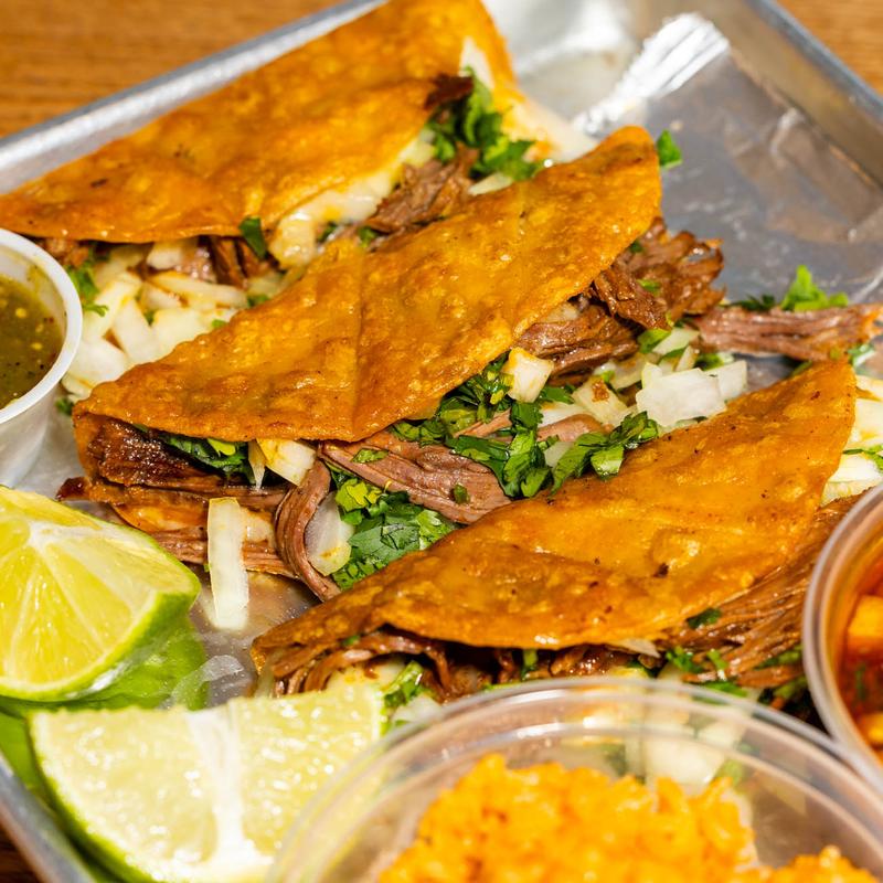 One beef "birria" brisket quesadilla and one flour tortilla. Topped with onions and cilantro. Served with lime, green salsa verde, and consome/broth.