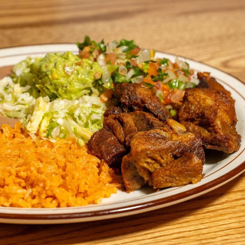 Pork tips, Mexican rice, refried beans, lettuce, pico de gallo, and guacamole. Served with flour tortillas.