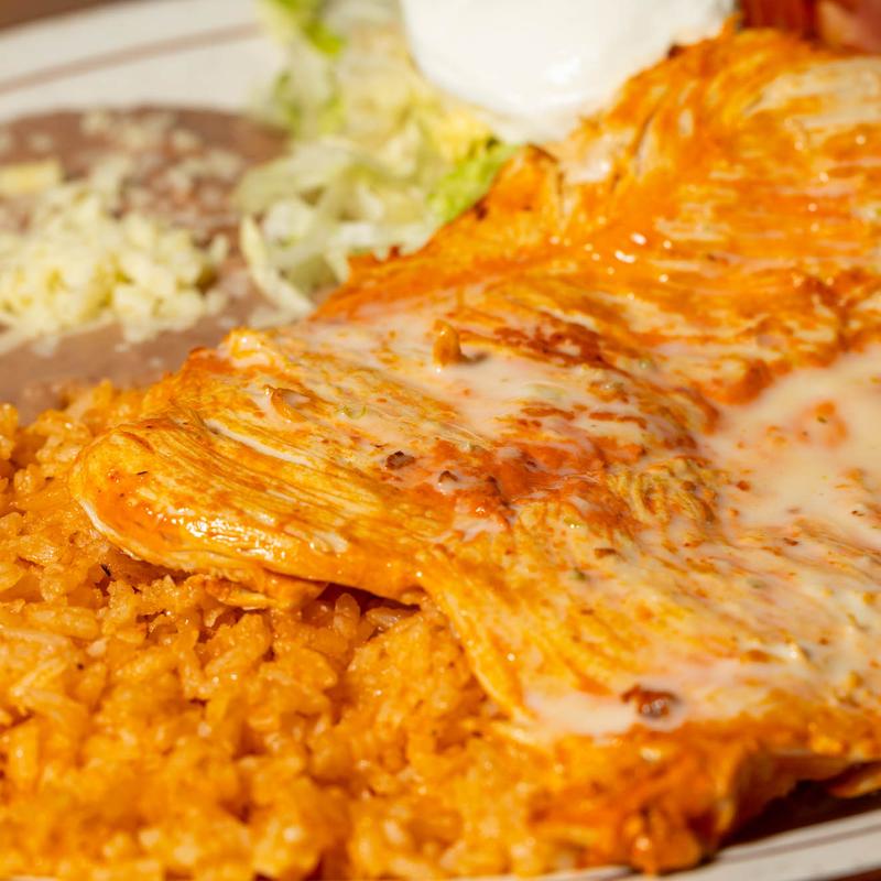 A flour tortilla filled with your choice of season ground beef, chopped beef, or shredded chicken. Served with Mexican rice and refried beans.